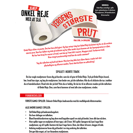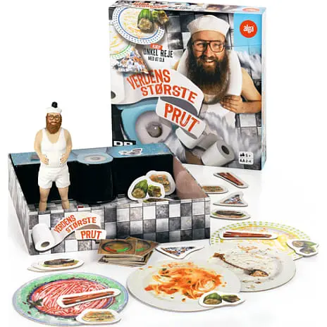Spændende indhold! Onkel Reje som 17 cm høj actionfigur, der taler og prutter. Indehold: Onkel Reje actionfigur 17 cm., spilleplade i æskeindsatsen, 4 tallerkner, 30 madjetoner, 24 hændelseskort, klistermærker samt regler.
