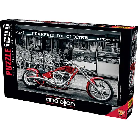 Dette puslespil illustrerer et billede af en chopper, der holder parkeret foran en café i Frankrig. Chopperen skiller sig ud fra den sort/hvide baggrund med sin røde farve og fine detaljer.