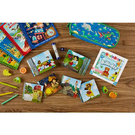 BrainBox Pictures indeholder 55 spillekort, der hver viser en hverdagsscene fra hjemmet eller uden for hjemmet. Kortene er levendegjort med håndtegnede illustrationer, der er detaljerede og meget detaljerede, så børnene kan nyde dem.