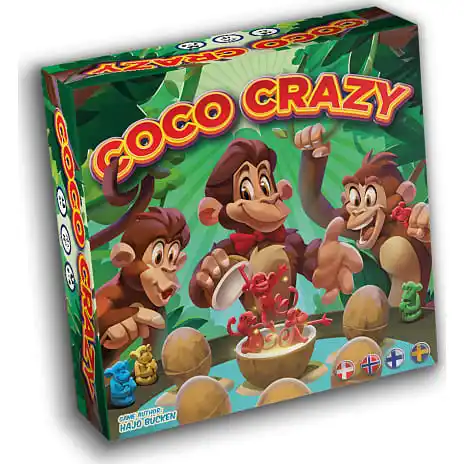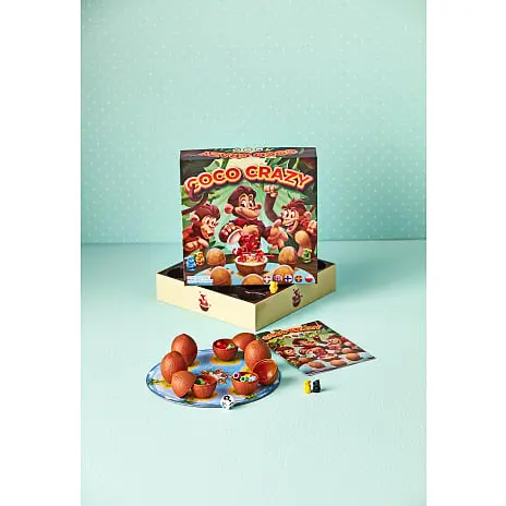 Coco Crazy er et sjovt spil for hele familien. Terningen fortæller hvad du må gøre på din tur, dreje brættet eller forsøge at finde en abe du mangler. Det er vigtigt at huske hvilke aber der gemmer sig i hvilken kokosnød.