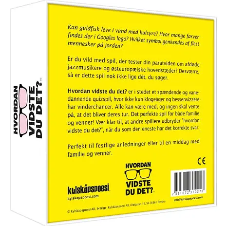 Hvordan vidste du det? er i stedet et spændende og vanedannende quizspil, hvor ikke kun klogeåger og besserwizzere har vinderchancer. Alle kan være med, og ingen skal vente på, at det bliver deres tur. Det perfekte spil for både familie og venner!