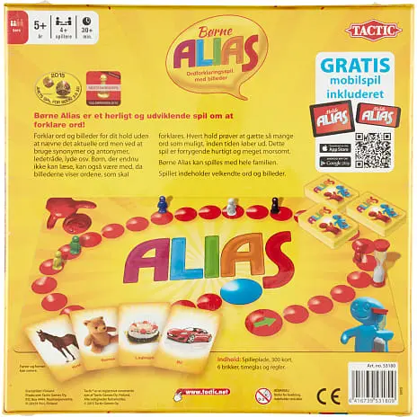 Ordforklaringsspil. Gæt det rigtige ord, og udvid samtidig dit ordforråd i dette sjove og enkle Junior Alias-ordforklaringsspil. Hvordan forklarer man et ord med … andre ord? Du får hurtigt en fornemmelse for det, når du kommer i gang med at spille spillet: Beskriv, gæt, og ryk frem på brættet, når du gætter det rigtige ord eller billede. Spillet spilles i hold. Det hold, der først passerer målstregen, vinder. For 4 eller flere spillere. Inkl. timeglas og 300 kort.