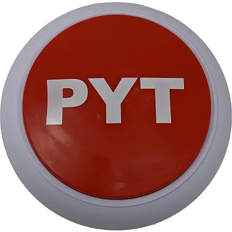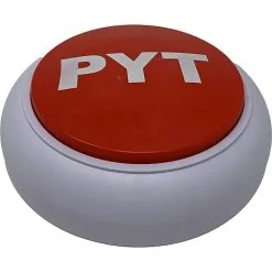 Den populære PYT knap med de sjove og afslappende sætninger. Tryk på knappen og den skifter mellem: