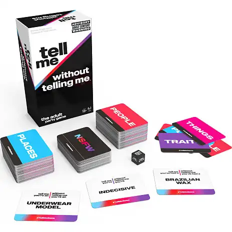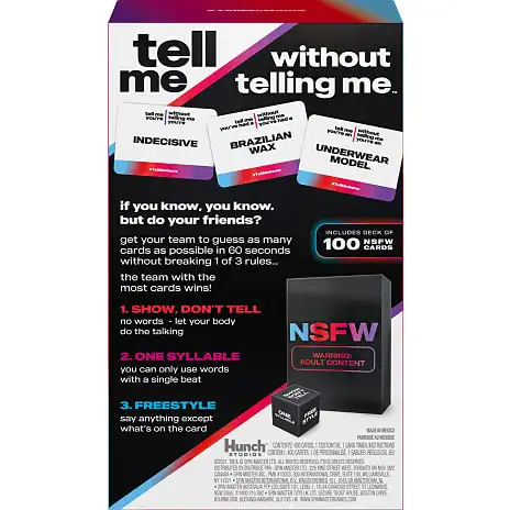 Dette nye kortspil fra Spin Master Games er den ultimative festaktivitet, som du gerne vil have i ærmet, uanset om det er på universitetet, til happy hour eller en polterabend. Det vil få alle til at optræde, grine, tale og måske endda rappe. Del jer op i 2 hold. Skiftende hold kaster terningen og vender derefter timeren for at starte holdets tur. Giv dit hold hints til at gætte så mange kort som muligt før tiden løber ud, uden at bryde terningens regel! Der er 3 kategorier på terningen. Vis det, ikke fortælle det: ingen ord er tilladt, lad din krop tale. Brug gerne rekvisitter! En stavelse: kun ord med en enkelt stavelse. Dette ville virke, men dette ville ikke fungere. Freestyle: Alle ord kan bruges, bare ikke hvad der står på kortet. Ingen fagter tilladt! Emnekategorier omfatter personer, træk, ting, steder og NSFW. Hvor mange kort kan du hjælpe dit hold med at gætte på 60 sekunder? Behold dine kort for at se, hvem der har mest til sidst… Det er det vindende hold. Dette spil er for teenagere og voksne fra 18 år og opefter, og det er på eget ansvar hvis du spiller med familie og kolleger! Dine venner vil helt sikkert dø af grin af de frække kort. Kortspillet er også en fantastisk gave til en festgave eller housewarming. Tag fat i dine yndlingsvenner og spil #TellMeGame så snart som muligt!