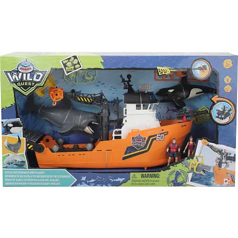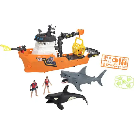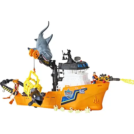 Der er en hel verden af vandlevende organismer at opdage, og du kan hjælpe oceanograferne med at udstikke kursen. Forskningsskibet er udstyret med alt, hvad der er nødvendigt for at finde og observere disse vidunderlige havdyr. Den fritgående båd har observationsstationer, luger, der åbner og lukker, humane fangstnet, en net scoop, der kan lanceres i vandet, et net og pully på bagsiden af båden, og en kran med optrækkelig zipline krog til at fastgøre til hvalselen og langsomt sænke væsen på dækket. Tryk på knapperne på toppen af båden for lys, havlyde og S.O.S. alarmer. Inkluderer en stor hvid haj og spækhugger med kæber, der chomp, når du trykker på deres finner, action figurer med poseable leddene, og fem glød-in-the mørke havdyr, snap-on scuba gear og andet tilbehør.