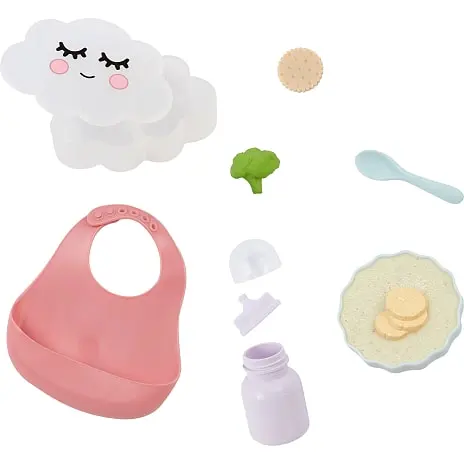 Dette Babi dukkepleje- og fodringssæt har følgende funktioner; hagesmæk, flaske, sutteflaske, sut, skyformet madbeholder, ske, ble + klud, beholder, gummiand, stabellegetøj med to aftagelige ringe, skål med havregryn og bananer, to broccoli og to småkager.