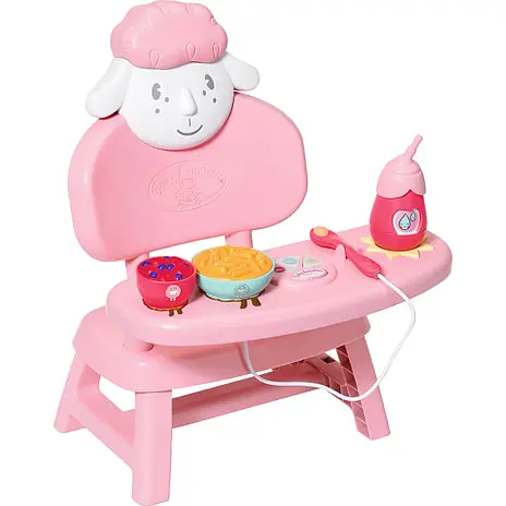 Baby Annabell spiser allerede mos. Men vi har ikke helt fundet ud af, hvilken slags, der er hendes yndlings. Den lyserøde stol med lammeryglænet og bord kan være til hjælp. Nu er det tid til hovedretten. Gulerodsmos eller ærtepure eller majsgrød? Når skålen bliver stillet på det rigtige får, vil lyd- og lyseffekter indikerer, om Baby Annabell kan lide sin frokost eller ej. Hvis feltet bliver grønt, vil den lille dukke mumle glad og vente på næste skefuld. Hvis det lyser rødt, kan du prøve at give hende en anden ret ellers vil Baby Annabell protesterer med et højt ”Ad!”. Til dessert er der budding, frugtkompot eller pærepure med en flaske mælk, æblejuice eller vand. Hvordan ser hendes yndlingsmenu mon ud i dag? Originalt tilbehør til Baby Annabell dukken. Produktet inkluderer: Frokostbord med lys- og lydeffekter 3 hovedretter 3 desserter. 1 flaske og 1 ske.