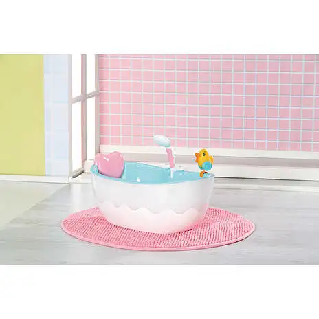Bruseknappen aktiverer den pinke og hvide bruser. Hvis badekarret er tomt, kan du høre pjaske- og typiske vandlyde. Hvis badekarret på forhånd er fyldt med vand, løber vandet gennem brusehovedet, som du kan vende mod badekarret, så der ikke løber vand uden for badekarret. Du kan også tage slangen ud, så du kan vaske BABY born grundigt eller gøre Bror endnu vådere.