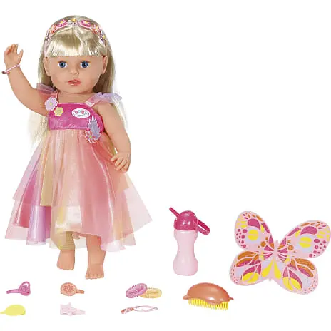 Fantasy Sister er BABY borns fortryllende lillesøster. Hun ligner en lille alf i sin kjole med tylnederdel i regnbuefarver og glitrende top. Hendes lange blonde hår kan sættes i skønne frisurer vha. penslen, to spiral-elastikker og fire clips. Hårbåndet med blomsternåle dekorerer frisurerne.
