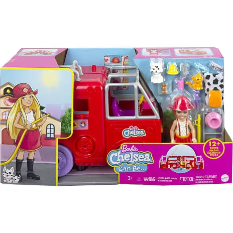 Børnene kan hjælpe Chelsea™ dukken med at redde situationen med hendes helt egen brandbil, der har rullende hjul og byder på så mange sjove lege og historier. Når Chelsea™ (15 cm) og hendes hund ankommer til stedet, kan børnene bruge brandstigen og den udfoldelige brandslange – derefter kan de folde legesættet ud for se endnu flere sjove detaljer, f.eks. en vask, førstehjælpsstation, køjeseng og meget mere. Chelsea™ dukken er iført den sødeste brandmandsuniform med aftagelig nederdel, hjem og støvler. Med klistermærkearket kan børnene dekorere Chelsea™ dukkens brandbil, mens de mere end 15 stykker tilbehør bl.a. består af en stol, kæledyr og meget mere. Legesættet kan foldes pænt sammen og indeholde dukken og tilbehør – så det kan nemt tages med til leg på farten. Dukken kan ikke stå selv. Farver og mønstre kan variere. Fantastisk gave til børn fra 3 år.