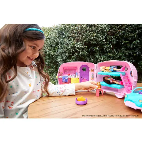 • Sæt campingvognen på bilen, placer Chelsea-dukken på førersædet, og tryk for at køre derudad!