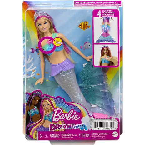 Dyk ned i fantasien og fine fortællinger med Barbie™ Dreamtopia Twinkle Lights Mermaid™-dukken med magisk lysfunktion. Dyp den smukke Barbie®-havfruedukke i vand for at se hendes perlemorsskinnende hale glimte i et af fire mulige farvestrålende lysshows. Barbie™ Dreamtopia Twinkle Lights Mermaid™-dukken gør lykke i badekarret eller poolen, men børnene kan også more sig på land. Tryk på den stjerneformede knap på Barbie®-dukkens dragt for at se lysshowet uden vand. Regnbuefinner, lyserøde striber i håret og et prinsessediadem fuldender Barbie®-dukkens farverige havfruelook. Perfekt til badetid og vandleg (kræver voksent opsyn). Barbie™ Dreamtopia Twinkle Lights Mermaid™-dukken er en fantastisk gave til børn i alderen 3 til 7. Dukkerne kan ikke svømme eller stå af sig selv. Farver og mønstre kan variere.