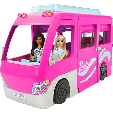 Få den ultimative campingtur med Barbie®-drømmeautocamperen. Med syv legeområder, en episk rutsjebane og masser af tilbehør til at fortælle historier inspirerer denne Barbie®-autocamper til endeløse eventyr udenfor. Den har rullende hjul og et førerhus med to sæder, så børn kan læsse autocamperen og køre hen til deres drømmedestination. Når de ankommer, kan autocamperen åbnes ind til et køkken, spiseområde, soveområde, badeværelse, en pool, rutsjebane og et opholdsområde med et tv. Hjælp Barbie®-dukken og hendes venner med at komme op af stigen, og send dem på en tur ned ad rutsjebanen og ned i poolen med et stort plask. Tilpas Barbie®-dukkens tur med et ark klistermærker med campingtema, og gå på opdagelse i endeløse legemuligheder med mere end 60 stk. tilbehør, bl.a. to hundehvalpe. Når barnet er parat til at kaste sig ud i nye eventyr, kan alting pakkes sammen, og autocamperen lukkes, inden der køres videre. Børn fra 3 år vil få en masse sjov ud af en køretur med Barbie®-drømmeautocamperen, for med Barbie® kan du være hvad som helst. Dukker medfølger ikke. Farver og mønstre kan variere.
