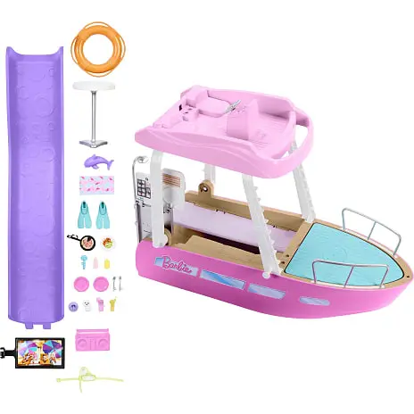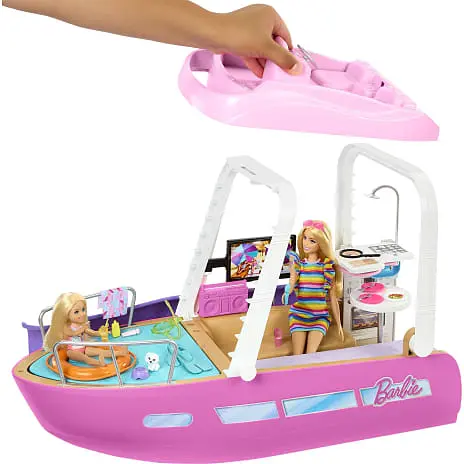 Tag på eventyr på havet med dette Barbie®-drømmeskib! Med over 20 dele og seks forskellige legeområder, inklusive en pool og rutsjebane, er Barbie® Dream Boat™-legesættet som skabt til sjov i bølgerne. Desuden betyder størrelsen (knap 1 m i bredden og 30 cm i højden), at der er masser af plads til, at Barbie®-dukken kan invitere sine venner og have det sjovt i solen! Dukke medfølger ikke. Farver og mønstre kan afvige fra det viste.