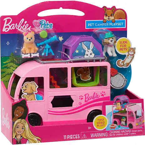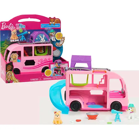 Rejs med stil med Barbie Pet Camper Legesættet. Denne lyserøde autocamper med fungerende hjul har det nyeste inden for komfort til 2 surprise Barbie-kæledyr. Find masser af sjovt tilbehør, herunder et aftageligt telt, teleskop, grill med bøf, 2 kødben og en frisbee. Børn vil nyde de tre etager med campingsjov. Hovedkabinen har en luksuriøs kæledyrsseng. Ovenpå finder du en svingende hængekøje og en rutchebane, der kan fastgøres. Åbn taglugen, slå et telt op og forestil dig, at du udforsker nattehimlen med teleskopet. Når det er tid til at tage af sted, pakker du sammen og opbevarer alt kæledyrstilbehøret indeni. Så køres camperen til næste spændende destination! Denne dejlige camper passer til andre Barbie Pets-legetøjsfigurer og legesæt.