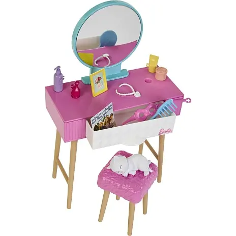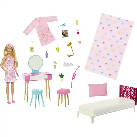 Barbie®-dukken hygger sig så meget med dette soveværelseslegesæt. Med en seng, et natbord, et sminkebord og masser af tematilbehør kan børn lege morgen- og aftenrutine eller finde på egne kreative historier. Detaljer som en søvnig killing og en blød morgenkåbe giver endnu mere hygge. Dukken kan ikke stå af sig selv. Farver og mønstre kan afvige fra det viste.