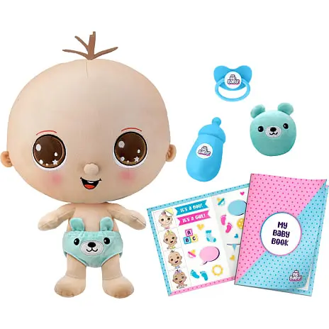 Blød babydukke i stof. Træk i den magiske snor på emballagen og se dukken blive op til 3 gange større. Med magnet så sutten kan sidde fast. Giv dukken sutteflaske og hør den sige suttelyde. Dukken kan bøvse, græde, grine og prutte samt sige mama og dada. Inkl. bog, stickers, plysdyr, sut og sutteflaske. H: 45 cm. Ekskl. batterier.