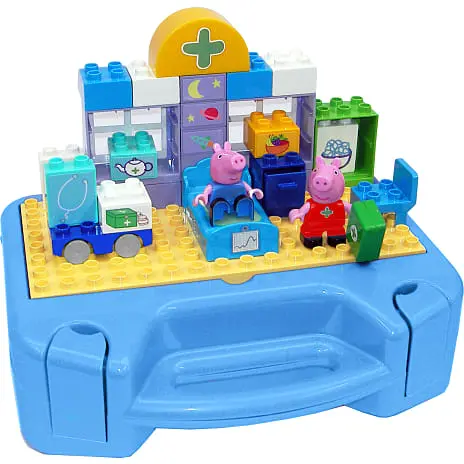Pakken indeholder klodser til at bygge en lægeklinik inklusiv møbler og medicin, samt stor plade som kan bruges som gulv.