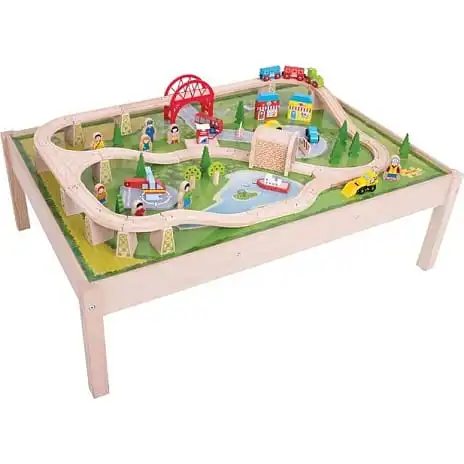 Dette legebord med togbane gør det nemt for børnene at lege sammen. Togrejsen går genne, by og land. Kun fantasien sætter grænser for de mange eventyr der kan ske undervejs! Produktet indeholder 59 dele.