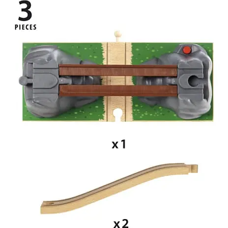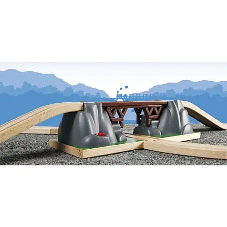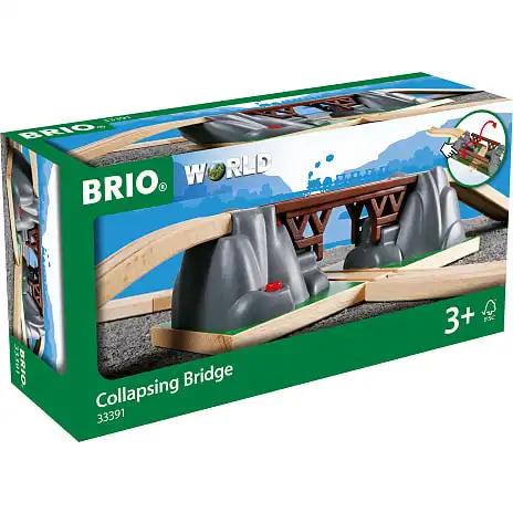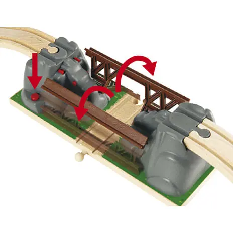 Klar, parat, fald sammen! Tryk på den røde knap for at få broen til at falde sammen, så der ikke kan komme tog over, før broen er bygget op igen. Indeholder 2 opfartsskinner og en træbase med indbygget spor til flere sportilslutninger nedenunder. Fra 3 år.