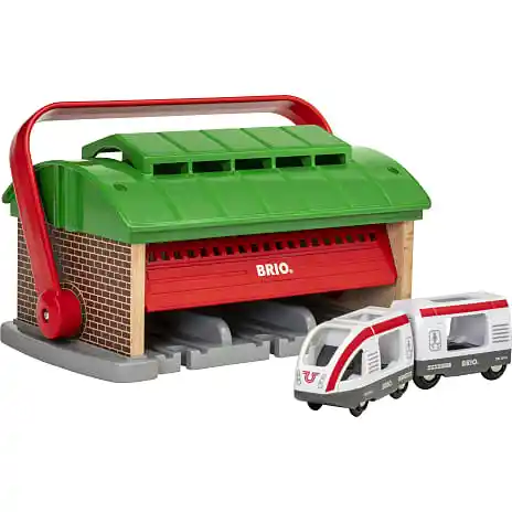 33474 Toggarage med håndtag giver legetøjstogene et perfekt sted til vedligeholdelse og pauser og er et fantastisk supplement til enhver BRIO World togbane. Garagen har tre parkeringspladser med hver sin sporforbindelse. Træk det store, røde håndtag tilbage for at åbne porten automatisk og give nem adgang til passagertoget og vognen indeni. Når døren er lukket igen kan håndtaget låses i lodret position, så det er nemt for barnet at bære toggaragen med indhold videre til næste eventyr. Forbind toggaragen med din eksisterende BRIO World togbane via de tre separate sporforbindelser. Virkelighedsbaseret togbaneleg hjælper barnet med at forstå og lære om omgivelserne på en sjov måde og samtidig udvikle sine finmotoriske færdigheder. Incl. passagertog. Til børn i alderen 3+.