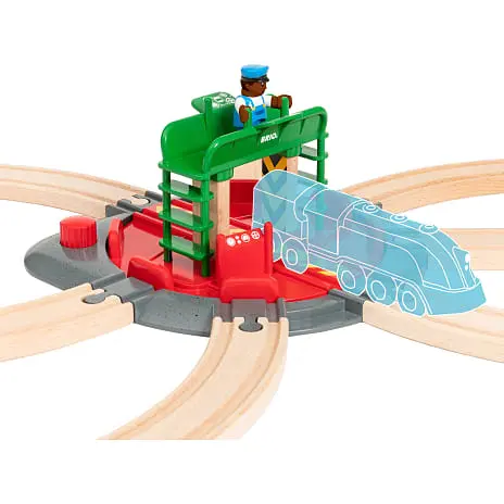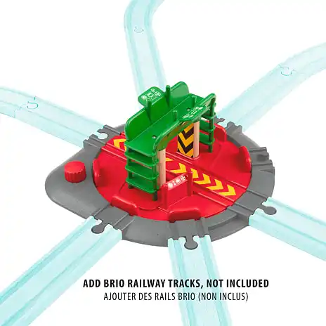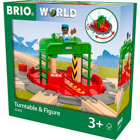 Drejeskive til togbane med syv sporforbindelser, roterende central del, der er stor nok til et lokomotiv fra BRIO World og en togingeniør-figur. Drej på den røde knap på drejeskiven, og se den store centrale del rotere, til den klikker ind i en af de syv sporpositioner. Togingeniør-figuren er klar til at betjene drejeskiven fra sin kontrolstation – sørg for, at han holder godt fast, når drejeskiven begynder at dreje rundt. Forbind drejeskiven til din eksisterende togbane i træ i syv forskellige retninger, og skab et nyt centrum for din BRIO World togbane. Virkelighedsbaseret togbaneleg hjælper barnet med at forstå og lære om omgivelserne på en sjov måde og samtidig udvikle sine finmotoriske færdigheder.