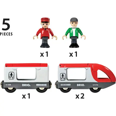 Tog med for-, mellem- og bagvogne der passer til alle BRIO togbaner. Inkl. passagér og lokofører. 5 dele. Fra 3 år.