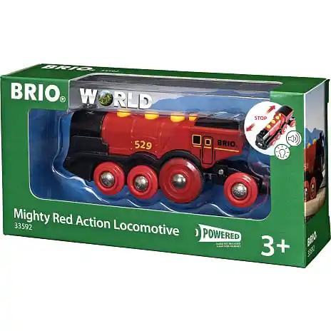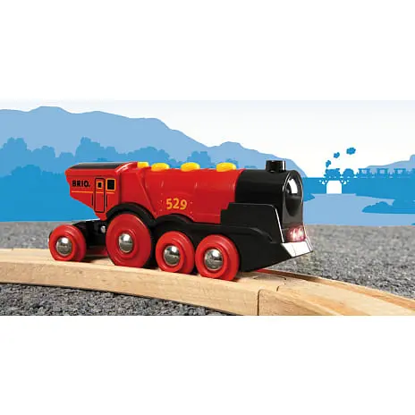 Gør den kommende togfører glad! Det store batteridrevne lokomotiv har to forlygter og manuelle knapper til “fuld fart frem”, bakfunktion og de karakteristiske “fut-fut”-lyde. Kontakten på toppen giver fri bevægelse af hjulene uden batterier. Bruger 2 stk. AAA batterier (ikke incl.). Fra 3 år.