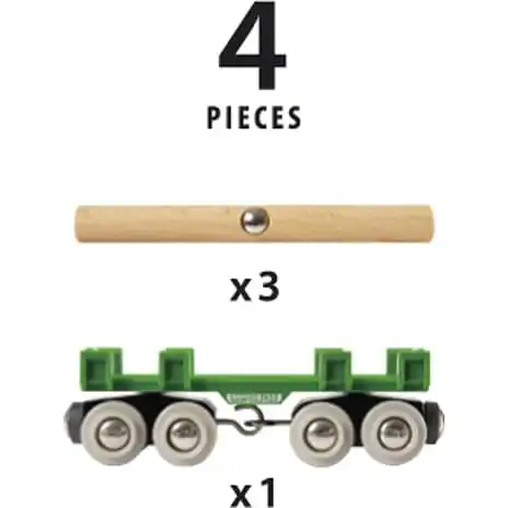 Stabl og kom afsted. Læs stammerne på toget og kør af sted. Hvert stykke tømmer passer perfekt på vognen, og med vognen med de 8 hjul på skinnerne bliver turen fra skoven en leg. Fra 3 år.