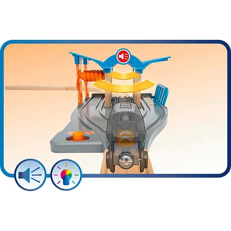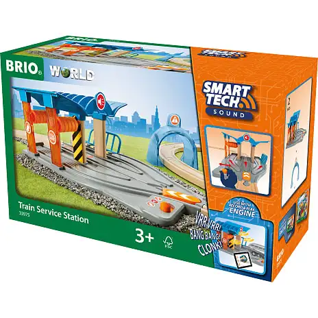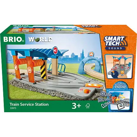Der skal foretages reparationer, og nogle af legetøjstogene trænger også til en grundig vask. Heldigvis tilbyder togservicestationen 33975 en fuld service til alle BRIO World tog, der passerer igennem. Brug togservicestationen med 33971 lokomotiv med optagefunktion (medfølger ikke) til at tilføje endnu mere action til din togbaneleg med Smart Tech Sound-funktioner. Send lokomotivet til venstre for en rengøring i vaskehallen, til højre for en reparation i værkstedet eller lige igennem, hvis der ikke er noget arbejde at gøre. Toget kommer automatisk til live med realistiske toglyde og animationer, og du kan også tilpasse din leg endnu mere med Smart Tech Sound app. Forbind Smart Tech Sound lokomotiv med optagefunktion (medfølger ikke) for at programmere legen med Smart Tech Sound-funktioner som bevægelse, farvet lys og tilpassede lyde. Et fantastisk supplement til enhver BRIO World togbane fremstillet i FSC-certificeret europæisk bøgetræ, kvalitetsplastik og fine metaldetaljer. Virkelighedstro togbaneleg hjælper barnet med at forstå og lære om omgivelserne på en sjov måde og samtidig udvikle sine finmotoriske færdigheder. Incl. action-tunnel. Til børn i alderen 3+.