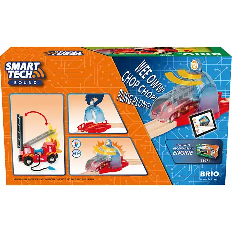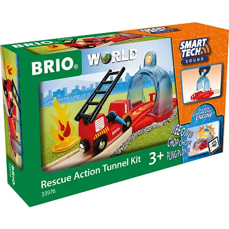 ”Åh nej! Det brænder!”. Dette 33976 Rednings Action Tunnel-sæt tilføjer brandslukningseventyr til din BRIO World togbane. Hjælp brandmændene med at slukke den voldsomme brand med brandbilens vandslange. Brug Rednings Action Tunnel-sættet sammen med lokomotiv 33971 med optagefunktion (medfølger ikke) for at få endnu mere action med Smart Tech Sound-funktioner – hør de forud indspillede redningslyde, når toget kører gennem tunnellen, eller brug Smart Tech Sound app til at tilpasse omgivelserne endnu mere. Inkluderer rednings action tunnel, skinner til tunnelplatform, brandbil og brandtilbehør. Forbindes med Smart Tech Sound lokomotiv med optagefunktion (medfølger ikke) for at programmere legen med Smart Tech Sound-funktioner som bevægelse, farvet lys og tilpassede lyde. Et fantastisk supplement til enhver BRIO World togbane fremstillet i FSC-certificeret europæisk bøgetræ, kvalitetsplastik og fine metaldetaljer. Virkelighedstro togbaneleg hjælper barnet med at forstå og lære om omgivelserne på en sjov måde og samtidig udvikle sine finmotoriske færdigheder. I alt 4 dele. Til børn i alderen 3+.