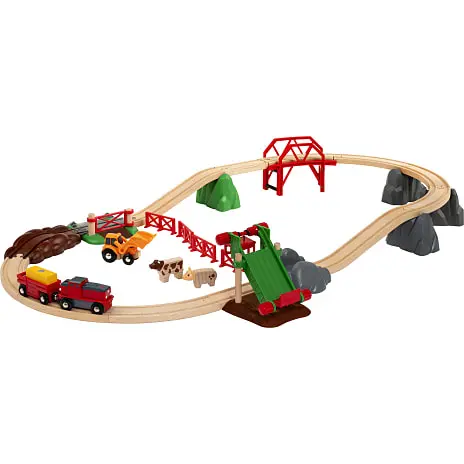 Togsæt med bondegårdstema og 30 dele der er klar til at sende dig tilbage til naturen med en fredfyldt bondegårdsstemning. Der venter masser af arbejde med dette batteridrevne godstog og høtransportøren. Fremstillet i europæisk bøgetræ, kvalitetsplastik og fine metaldetaljer. Når barnet vokser, kan togbanen vokse med, da dette togsæt kan forbindes med andre BRIO World passager- og godsvogne via magnetkobling. Virkelighedsbaseret bondegårds- og togbaneleg hjælper barnet med at forstå og lære om omgivelserne på en sjov måde og samtidig udvikle sine finmotoriske færdigheder. Til børn i alderen 3+. Lokomotiv bruger 1 stk. AA batteri (ikke incl.).