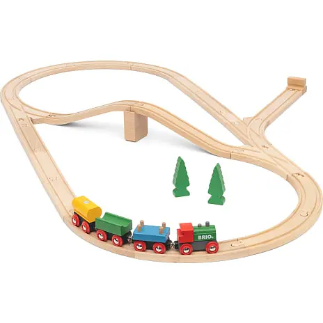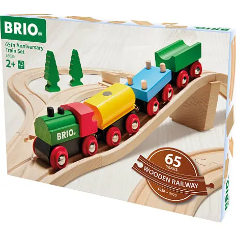 Fejr klassisk togbaneleg med 36036 65 års jubilæumstogsæt. Dette togsæt helt i træ er inspireret af vores ikoniske BRIO togbaneprodukter, der blev lanceret i 1958. Sættet med 32 dele er fremstillet af europæisk FSC®-certificeret bøgetræ og indeholder et klassisk BRIO-tog med 3 vogne i klare farver, bro, skiftespor og dekorative træer.