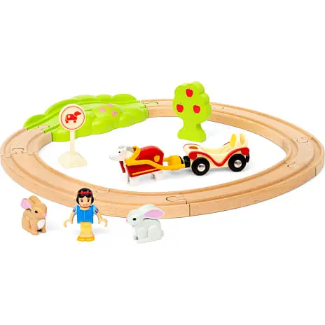 Tag med Disneys Snehvide og alle hendes fantastiske dyrevenner på eventyr i skoven med BRIO-togsæt. Hop om bord i Snehvides vogn, og sid bag den glade, hvide hest, når du tager på en fantasifuld tur gennem den lille, grønne skov. Sig ”hej” til alle skovens dyr – for eksempel de to små kaniner, når du kører forbi dem. Men pas på de blanke, røde æbler fra træet, et af dem kan være forgiftet!