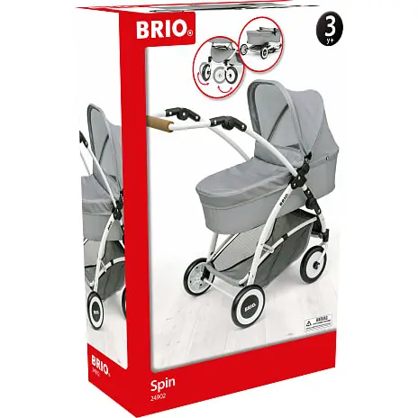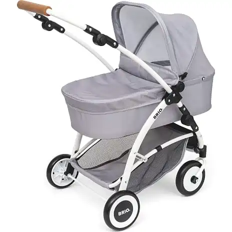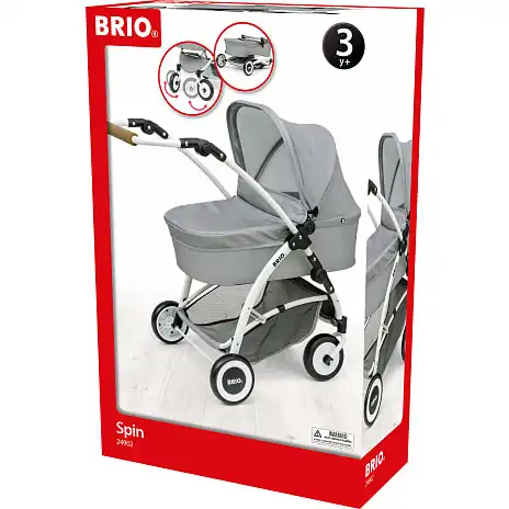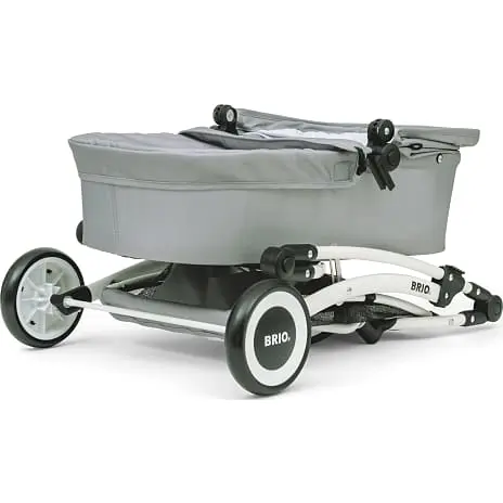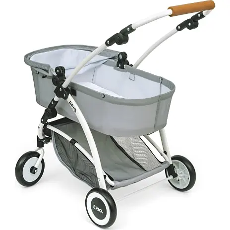 Luksusdukkevogn med alle de funktioner, der findes på moderne barnevogne: kaleche der kan slås ned, indkøbskurv, drejelige hjul, aftageligt stel, justerbart håndtag (kan justeres i flere højder) og sammenklapningsfunktion. Grå tekstil. Fra 3 år.