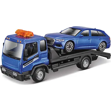 Blå bjærgningskøretøj med et køretøj til at hjælpe strandene biler tilbage på værkstedet. Her er der en bil inkluderet. Hjulene sidder frit og kan derfor dreje, når der køres med dem