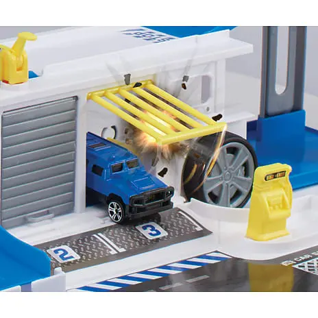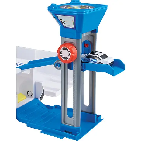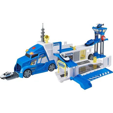 Den mobile kommandocentral forvandler sig fra en transportør til et spændende legesæt med lys og lyde! Oplev nødsirene og blinkende lys, når skurken bryder ud af fængslet og starter en politijagt! Transporteren er spækket med funktioner, herunder; bilfængsel, helikopterplads, politijagt-lanceringsrampe, fungerende billift, vippekaster og falddør, forbindende ramper mellem niveauerne og leveres med 5 trykstøbte køretøjer inkluderet! Transporteren foldes let sammen, hvilket gør den perfekt til mobil leg. Giver timevis af fantasifuld og kreativ sjov, leg med venner og hjælper udviklingen af dit lille barns sociale og finmotoriske færdigheder, da de er den perfekte størrelse for små hænder at skubbe med. trykstøbte køretøjer er robuste på grund af højkvalitets trykstøbte karosseri skal. Velegnet til alderen 3+.