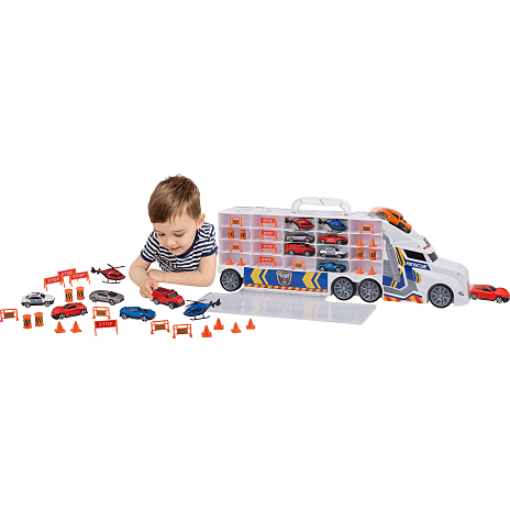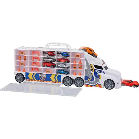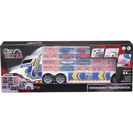 Denne redningslastbil er den perfekte måde for din lille chauffør at opbevare og transportere deres bilsamling! Transporteren inkluderer et udvalg af 7 x meget detaljerede brand-, politi- og lægekøretøjer i en række autentiske stilarter og masser af vejtilbehør. Den har også en køretur gennem rampen, så du kan affyre biler fra toppen af transportøren og se dem løbe til undsætning! Denne slanke og holdbare bæretaske er nem at bære og skubbe med, da den har frit bevægelige hjul, velegnet til alderen +3 år