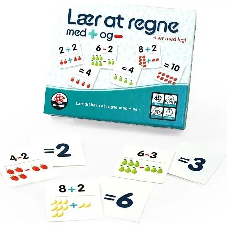 Lær med leg er en serie af spil, hvor børn netop lærer gennem leg. Spillene er en sjov og tryg måde at stifte bekendtskab med tal og bogstaver for børn i førskolealderen. Gennem spillene får børnene udviklet deres logik og koncentrationsevne. Med dette spil kan du lære dit barn om plus og minus med simple regnestykker. Spilletid ca. 15 min. For 1-2 spillere. Fra 5 år.
