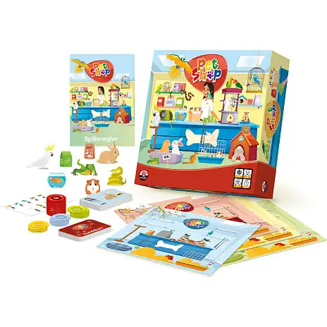 Pet Shop er et spil, hvor det handler om at lave den bedste handel… Vinderen er den spiller, som får købt og solgt flest dyr, og dermed er den første, som får købt kakaduen og solgt den igen til 1 million kroner. Til 2-4 spillere. Spilletid 30 min. Fra 6 år.