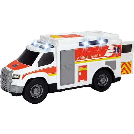 Denne ambulance er udstyret med blåt rotorblink samt lyden af sirener, så dit barn får så autentisk en oplevelse som muligt. Bagklappen på ambulancen kan åbnes, således der er plads til båren.