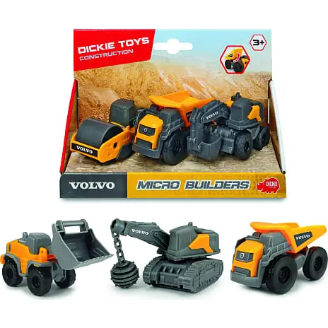 Med disse Dickie mini-industrimaskiner kan dit barn begynde sin konstruktion eller nedrivning. Dette sæt består af dumper, gummiged og nedbrydningsmaskine med kugle, som alle er designet så de ligner deres større originaler. Hvert køretøj er 10 cm og fås i forskellige sæt på 3 stk.