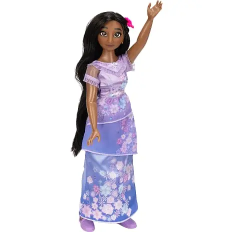 Isabela Madrigal fra Disneys Encanto er klædt i sit typiske tøj og accessories! Præcis som i filmen har Isabelas fine lavendelfarvede kjole smukke flæsedetaljer på krave og ærmer. Det yndefulde skørt i flere lag er dekoreret med smukke lyserøde, lilla og blå blomster, præcis som hendes kjole i Encanto! Isabelas imponerende blomster-hårspænde, yndige guldøreringe og lilla espadrillo-sko fuldender hendes klassiske look. Med denne Isabela Madrigal-dukke kan du lade som om, at du også har blomsterkræfter!