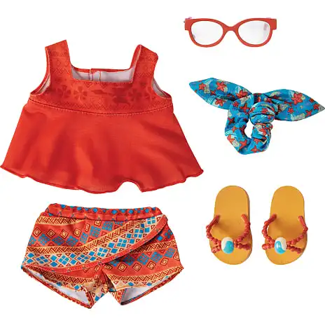 Dette dukketøj inspireret af Vaiana fra Disney ily 4EVER til 18-tommers dukker er perfekt til eventyr ved havet. Din dukke får det sjovt med at bygge sandslotte i en koralfarvet tanktop, matchende nederdel med indbyggede shorts og stropsandaler. Fuldend looket med et hårelastik med tropisk print og trendy solbriller til sjov i solen. Tøjet er vist på en dukke fra Disney ily 4EVER, og det passer til de fleste 18-tommers dukker. (Dukker sælges separat, kan købes i butikkerne)