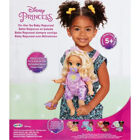 Med On-the-Go Baby Rapunzel kan du tage den Disney-prinsesse, som du elsker, med hvor som helst. Dette komplette plejesæt indeholder alt det, du skal bruge til at passe Rapunzel-babyen, fra en smukt dekoreret bæresele til en hagesmæk og en flaske. Luksusbæreselen har justerbare stopper for at give lethed og komfort, og Prinsesse Rapunzel vil se så yndig ud, når hun putter deri. Prinsesse Rapunzel kan selvfølgelig ikke gå nogen sted uden sit yndlingsplysdyr Pascal! Kram, elsk og pas Rapunzel-babyen med dette komplette On-the-Go Baby Rapunzel-sæt!