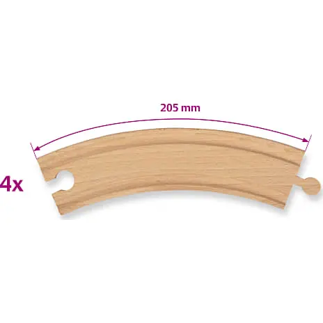 Med dette sæt på 4 korte bøjede togskinner får dit barn det nødvendige for at kunne udvide sin togbane. Skinnerne er lavet i robust bøgetræ, og er lavet i et børnevenligt design.