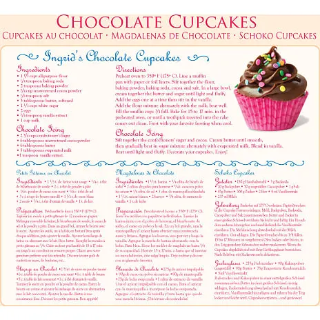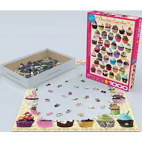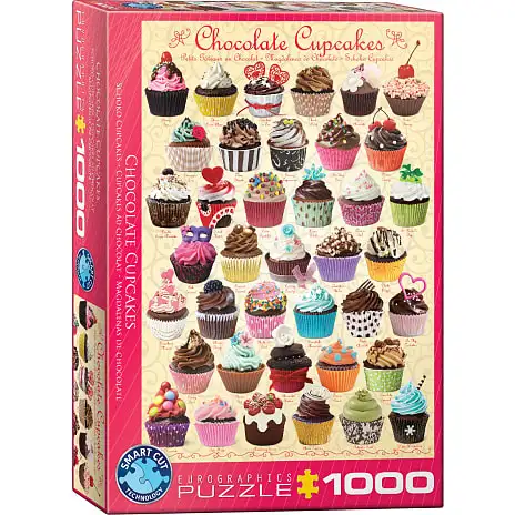 Dette puslespil illustrerer et sortiment af chokolade cupcakes udsmykket med forskellige toppings med opskrifter inkluderet på bagsiden af kassen.