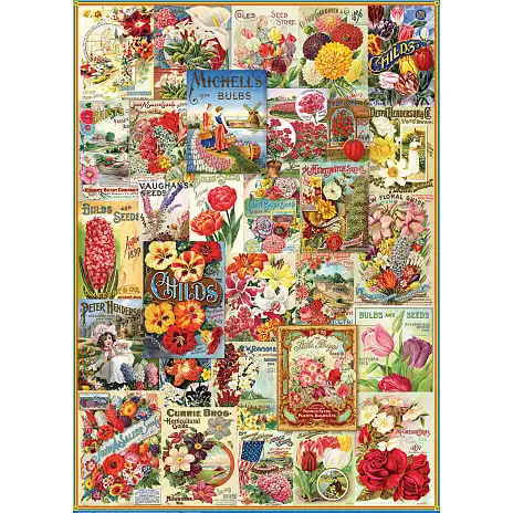 Dette puslespil illustrerer en collage af antikke poser med blomsterfrø, som viser poser helt tilbage fra 1830, der er med til at dokumentere historien af blomsterfrø.