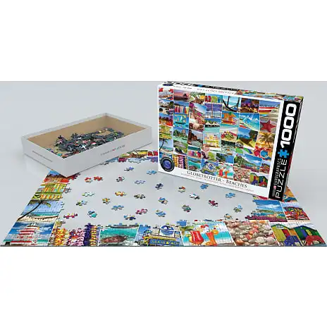 Dette puslespil illustrerer en samling af forskellige seværdigheder og andre kendetegn fra forskellige strande rundt omkring i verden.