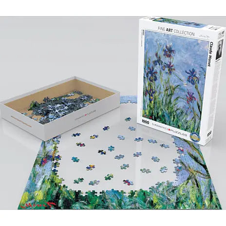 Dette puslespil illustrerer et billede af et af de mange iris-malerier, som er malet af den franske kunstmaler Claude Monet.